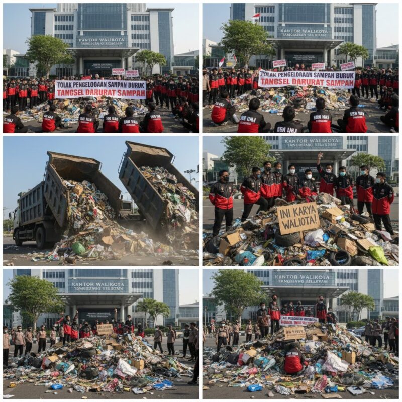 MATARAKYAT.ONLINE, TANGERANG SELATAN — Puluhan mahasiswa yang tergabung dalam Badan Eksekutif Mahasiswa Universitas Muhammadiyah Jakarta (BEM UMJ) menggelar aksi unjuk rasa di depan Kantor Wali Kota Tangerang Selatan, Kamis (8/1/2026). Dalam aksi tersebut, massa menumpahkan dua truk bermuatan sampah sebagai simbol protes terhadap buruknya pengelolaan persampahan di kota ini.