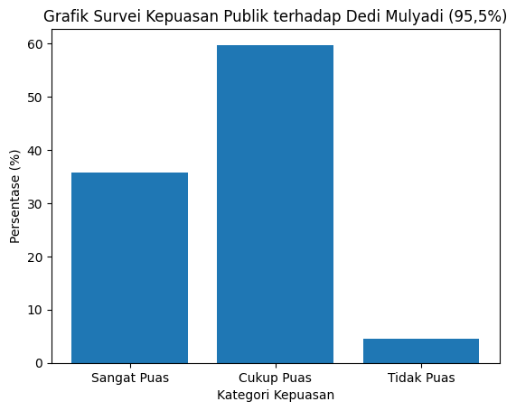Grafik Batang Survei Kepuasan Publik Visualisasi menunjukkan dominasi kategori Cukup Puas dan Sangat Puas, memperkuat fenomena langka tingkat kepuasan 95,5% terhadap kinerja Dedi Mulyadi.